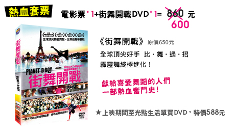 ★ 熱血套票 電影票1張+《街舞開戰》DVD1片 = 600元 (原價860元)